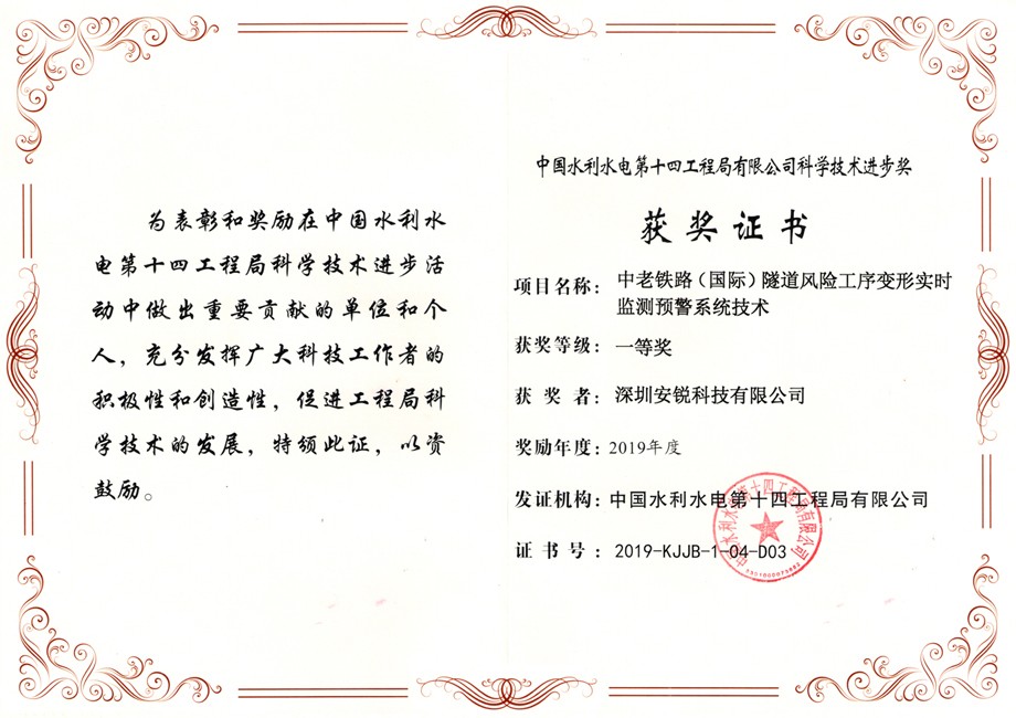 近日,由安锐科技研发的【中老铁路隧道风险工序变形实时监测预警系统】荣获中国水利水电第十四工程局颁发的科学技术进步一等奖。