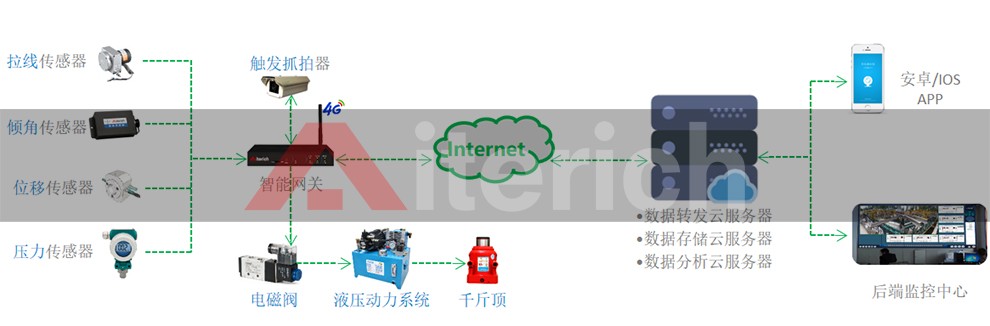 本项目针对杭州望江路隧道江北明挖段横穿的结构薄弱的220KV高压电力管廊进行实时监测及联动顶升控制。整套系统融合了前端高精度监测传感器、前端数据采集及联动控制网关、云端物联监测云平台、后端移动平台和监控中心平台。