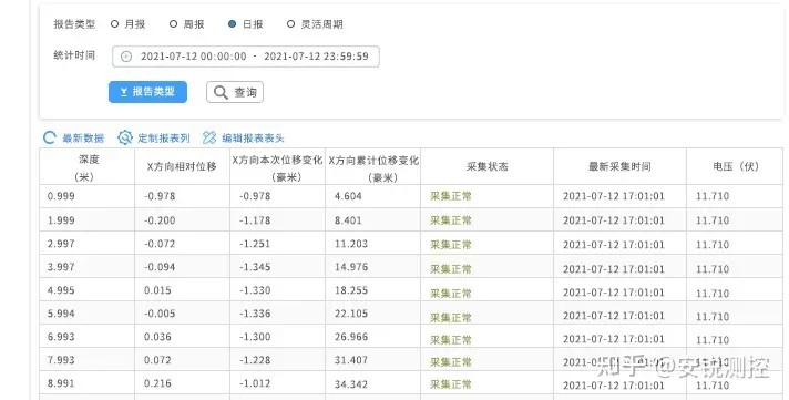 分析统计:云端接收到前端监测数据后,可自动对监测数据进行实时数据分析、处理、描绘变形曲线图,初步对监测结果进行预测,并可生成报表。