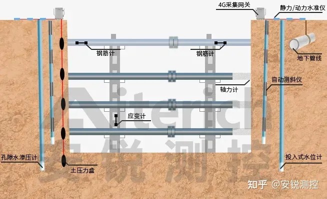 安锐测控基坑自动化监测系统主要由:监测传感器、边缘计算网关、云平台和监控管理几大部分组成,根据现场情况,采用各类传感器设备对基坑结构进行实时监测。