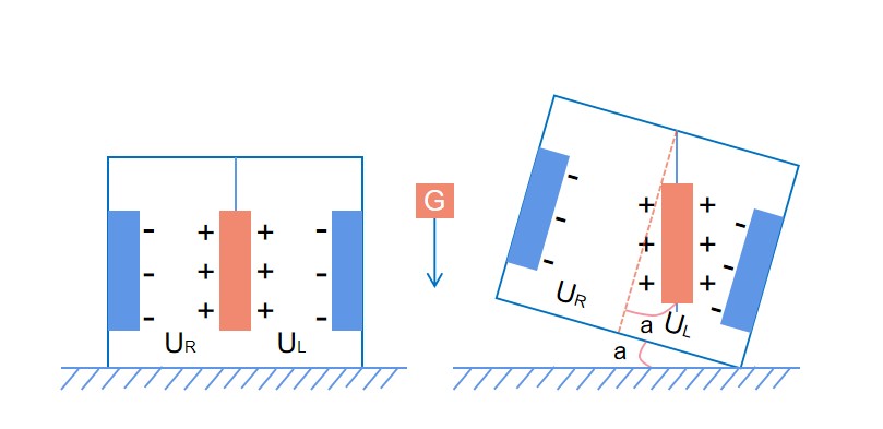 如何把倾角的状态转化为可供识别的物理量?工程师利用倾角改变带来电容、电阻、电流及磁场改变的原理来测量倾斜角度。这类型的倾角传感器体积大、功耗高、精度低,且只能测量静态倾角。典型的电容倾角传感器的原理如图所示。