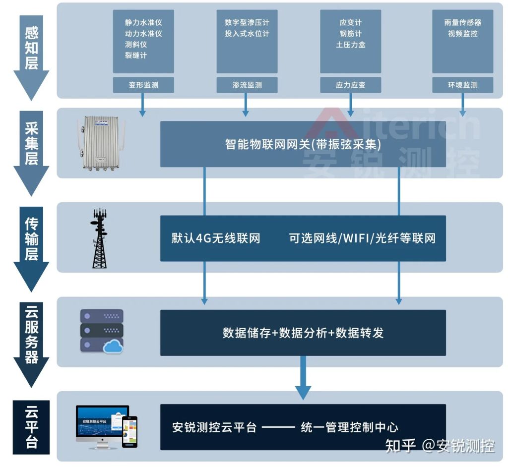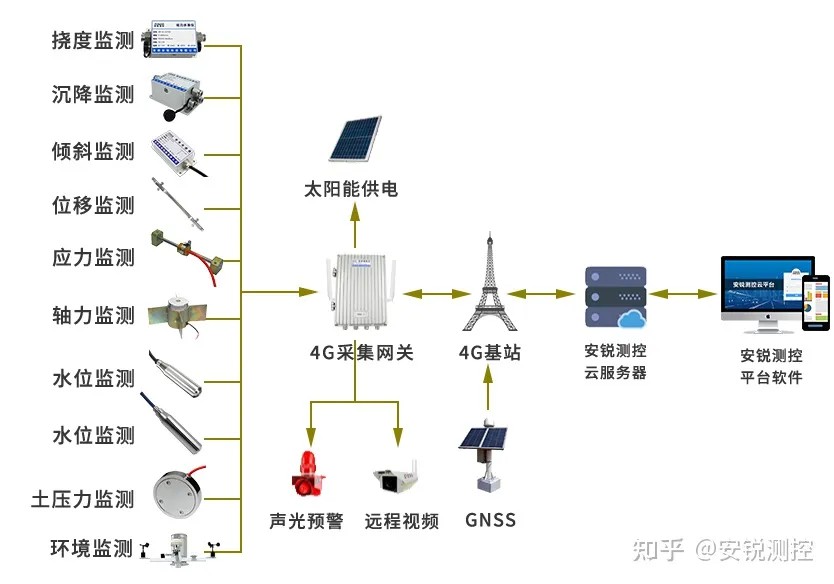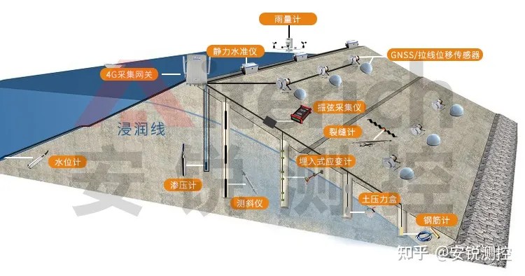 通过静力水准仪、渗压计、GNSS、测斜仪等布设在坝体内部和表面的各种类型的传感器,获取大坝变形、渗流、沉降、位移、水文、气象等相关数据,传输到安锐测控平台系统,实现对整个坝体的全方位实时监测。
