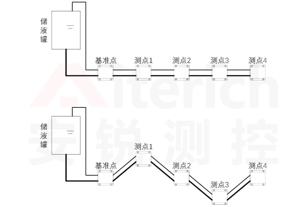 设定基准点(稳定保持不动),测点1上抬,测点2不变,测点3下沉,测点4不变,当系统内液面达到平衡后形成新的水准面▽i0,则各测点连通容器内的新液位值分别为:H基、H1、H2、H3、H4、······Hi。