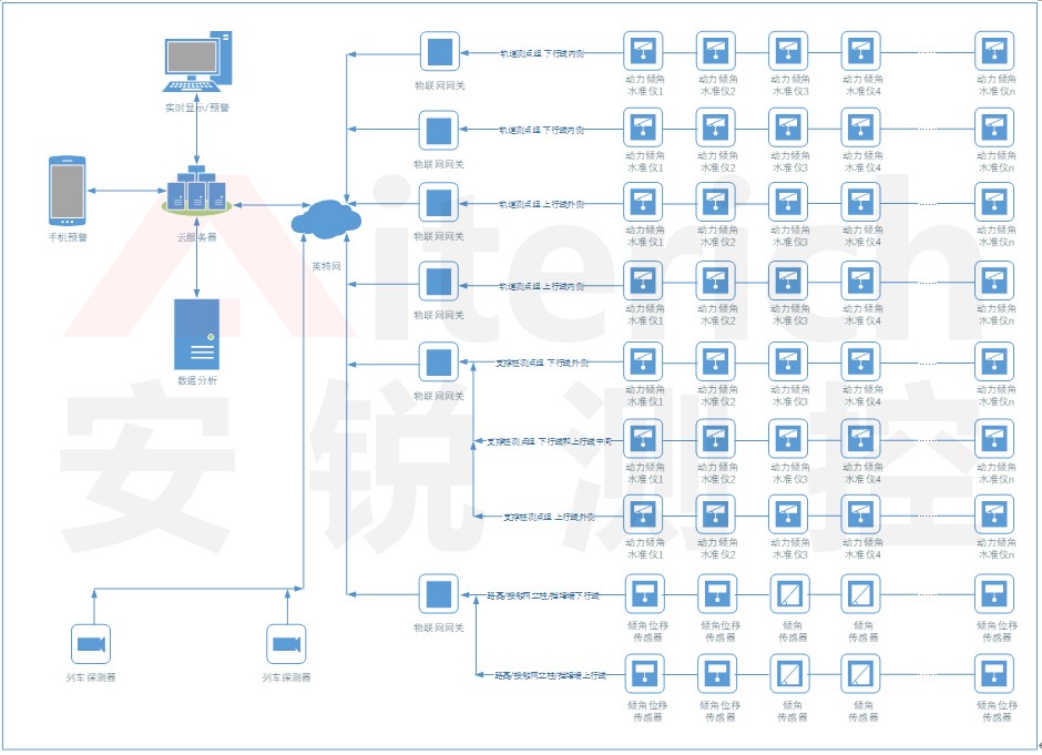 传感器数据采集部分使用深圳安锐科技的动力水准仪及配套的物联网关,以实现海量动态数据的本地化边缘计算,结果再上传安锐测控云平台,从而实现现场报警及数据显示等功能。