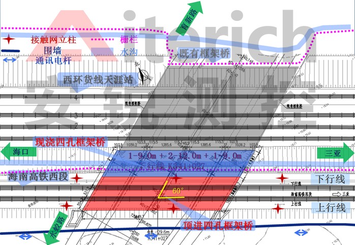 三横路凤凰段工程(二期)道路全长4.430km,建成后将是三亚火车站与三亚凤凰国际机场之间的快捷通道。K0+120-K0+460(二标段)项目主要建设内容中的桥梁(下穿西环高铁顶进框架桥)部分,与海南环岛高铁西段交叉采用框架桥方式下穿铁路路基,框架桥长29.6m,共4孔框架,两侧各设一孔非机动车道(含人行道,框架内宽9.0m、内高6.5m),中间设两孔机动车道(框架内12.0m、内高6.1m)。