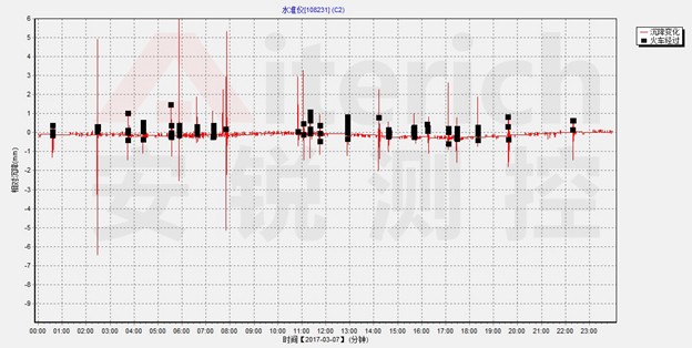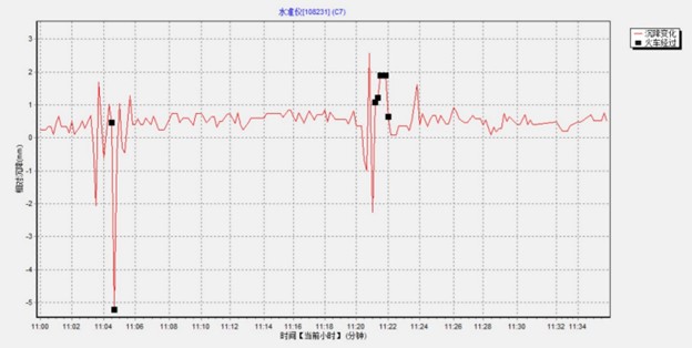 传统静力水准仪应用在涉铁监测项目,在列车经过时,需要特殊标记列车经过时的数据,对这些数据进行丢弃过滤处理。图3-3和图3-4为静力水准仪在铁路上的实际应用,获取的静态采集数据。图中黑点表示火车经过是的数据,可以看出火车经过时,数据波动极大,远远超过正常值的数十倍。如果采用该时间段的数据,每次火车经过都将导致错误的报警,严重干扰施工秩序。而本次课题的研究将很好的解决这一问题。