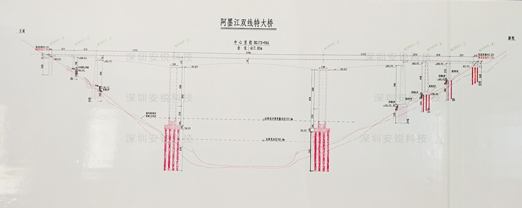 阿墨江双线特大桥是我国目前最大跨度的铁路连续钢构梁。位于墨江县境内,全长617.05米,其主跨为216米的连续刚构梁,多达132个节段。3、4号主墩墩高均达89.5米,桥位处平均水深达48米左右,存在大体积深水基础、超高超大体积0#段、超大体积悬臂段、70m超高空边跨现浇段,是玉磨铁路全线施工组织难度最大、地质条件最复杂、安全风险最高的八大控制性工程之一。