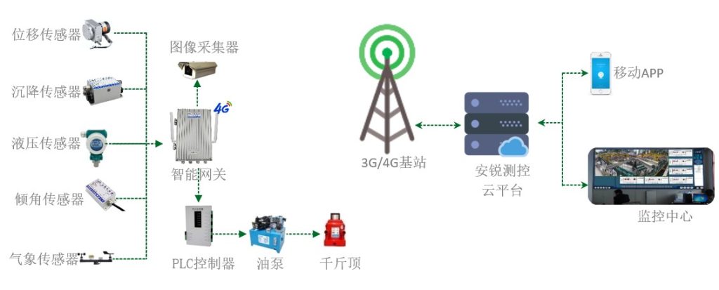 本项目中主要用到高精度动力水准仪、静力水准仪、振弦式应变计、高精度倾角传感器、荷载传感器、拉线位移传感器、加速度传感器、图像采集器、智能物联网网关、电磁阀、油泵、千斤顶、工字钢等辅材、安锐测控云平台等。