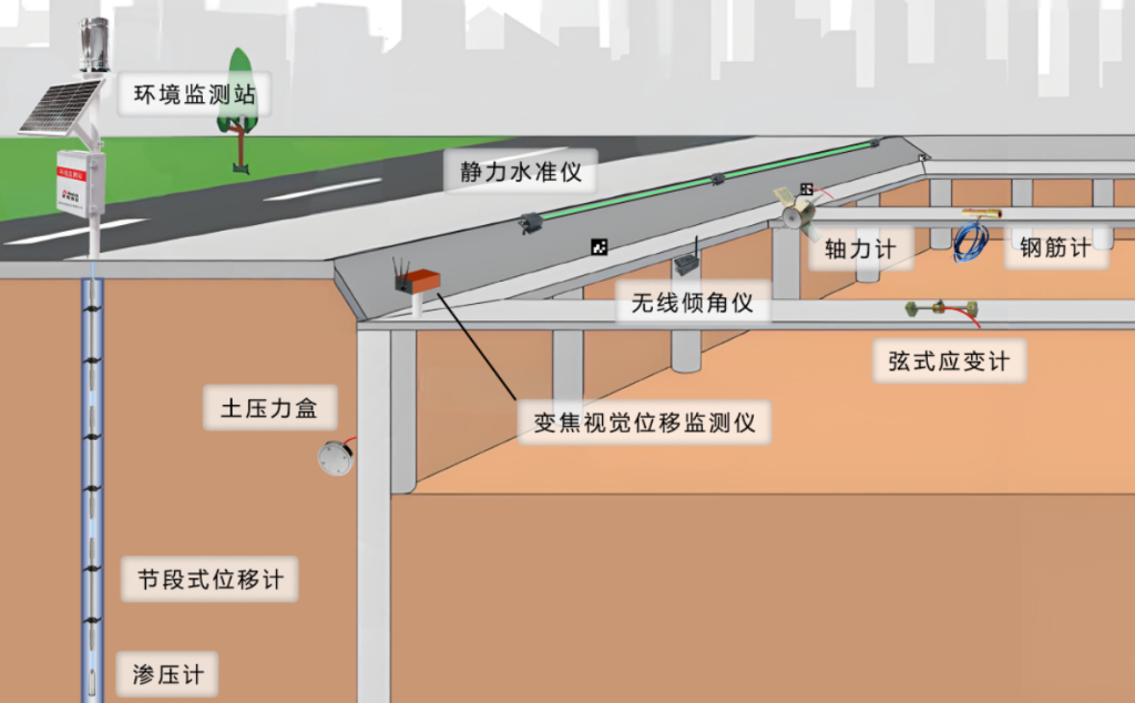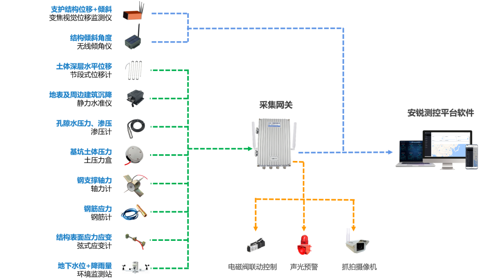 智能基坑监测评估系统是由前端高精度传感器、中端数据采集传输设备与后端安锐云平台组成的自动化安全监测体系。该系统通过在基坑围护结构(排桩、地下连续墙)、周边土体、邻近建筑及管线等关键区域布设传感器,实时采集土体深层位移、支护桩倾斜、地表沉降、支护结构应力、地下水位及周边管线变形等核心参数,实现对基坑稳定性与周边环境影响的动态感知。