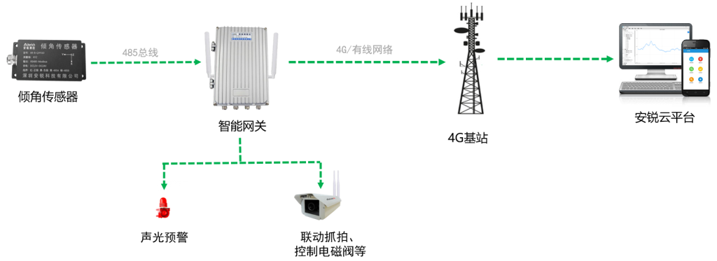 系统主要由倾角传感器、智能网关、4G基站以及安锐测控云平台组成。