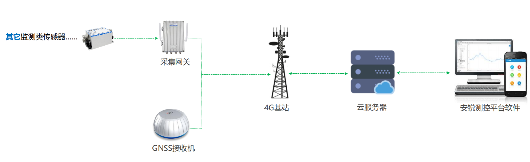 GNSS接受机可与其它类型的监测设备组合,形成完整的自动化监测预警解决方案。
