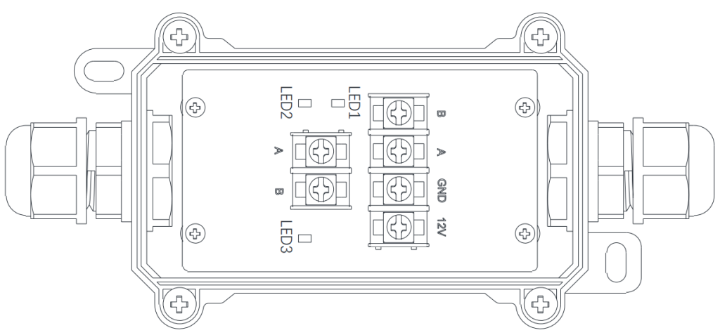 接线说明1、拧松上盖的四颗自攻螺丝,打开上盖2、将二芯通讯线缆从二芯接线端子一侧的防水接头穿入,对照对应产品的颜色功能,将电缆接在二芯接线端子上。3、将四芯通讯线缆从四芯接线端子一侧的防水接头穿入,对照对应产品的颜色功能,将电缆接在四芯接线端子上。4、将上盖安装回主壳体,拧紧自攻螺丝。注意上盖和主壳体之间的防水胶圈放置平整。防水接头拧紧。
