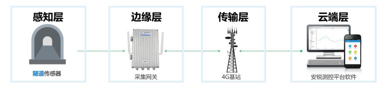安锐隧道结构安全监测系统采用 “前端感知层 + 边缘采集与测控层 + 通讯传输层 + 安锐测控云平台” 的四层整体架构,构建从隧道现场到云端管控的完整监测闭环,核心工作原理如下: